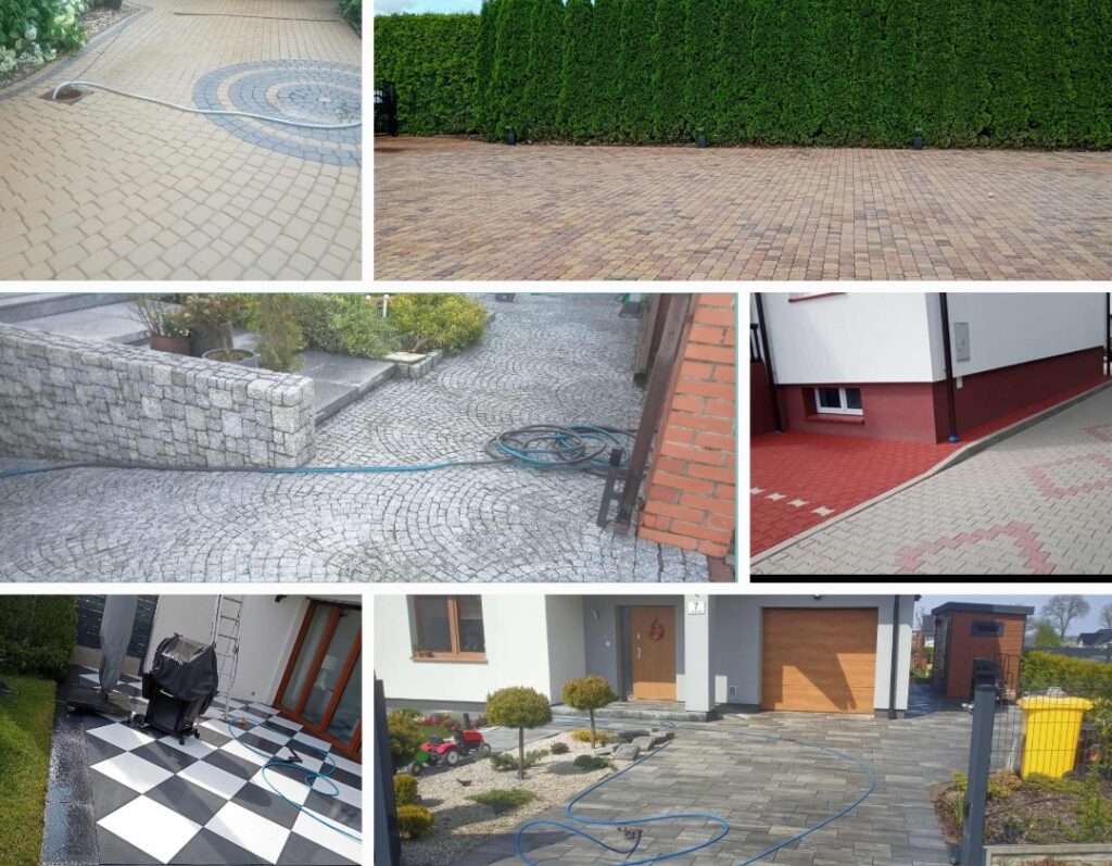 Czyszczenie kostki brukowej , Spoinowanie , Malowanie ( odświeżanie , zmiana koloru ). Oferujemy Państwu mycie gorącą wodą z codziennych zabrudzeń jak również usuwanie wykwitów , plam po olejach , śladów opon , pozostałości materiałów budowlanych ( kleje, tynki , smoła ). Dodatkowo na życzenie Klienta wykonujemy Spoinowanie czyli wypełnianie ubytków powstałych na skutek usuwania zabrudzeń z fug.
